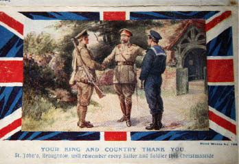 At Reningelst there were about 30 of us in one of a group of huts situated right out in open country and if my memory holds good we were in the charge of a Lieutenant Whittingham. My War Diary records nothing f the several weeks spent on the signalling course and the only tangible record I have of it is that of a card sent to me from St John’s Church, Higher Broughton at Christmas time. On the reverse of the card is noted that I spent Christmas 1917 and New Year at Reningelst.